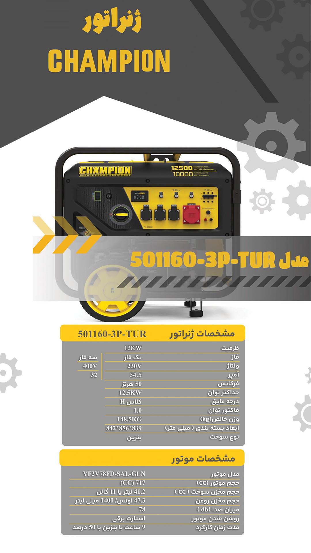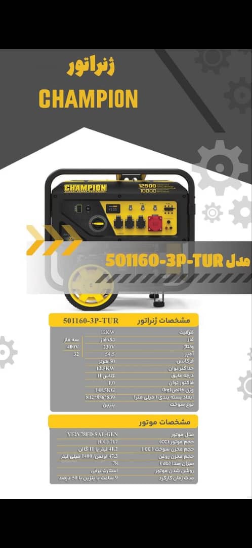 چمپیون یکی از برندهای معتبر آمریکایی در زمینه تولید ژنراتورهای قابل حمل و موتور برق است. محصولات این برند به دلیل کیفیت ساخت بالا، دوام زیاد، صدای کم و مصرف سوخت بهینه، در بازار جهانی و ایران محبوبیت زیادی دارند.